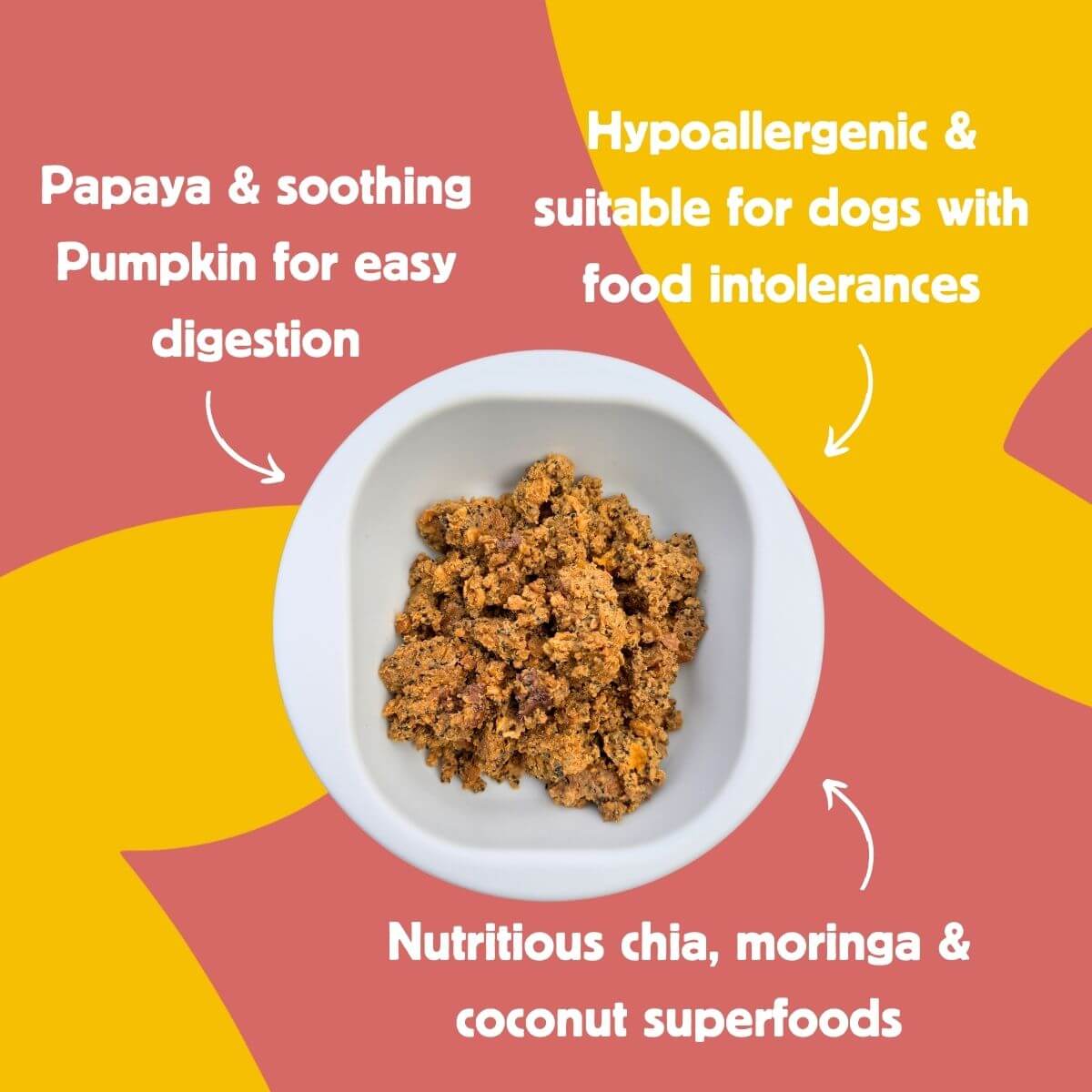 Taking inspiration from one of our nation’s favourite cuisines, Fragrant Papaya Chia & Lentil Dahl with Coconut & Moringa is a delicious nutritionally complete meat alternative to serve to your four-legged best friend at dinnertime.