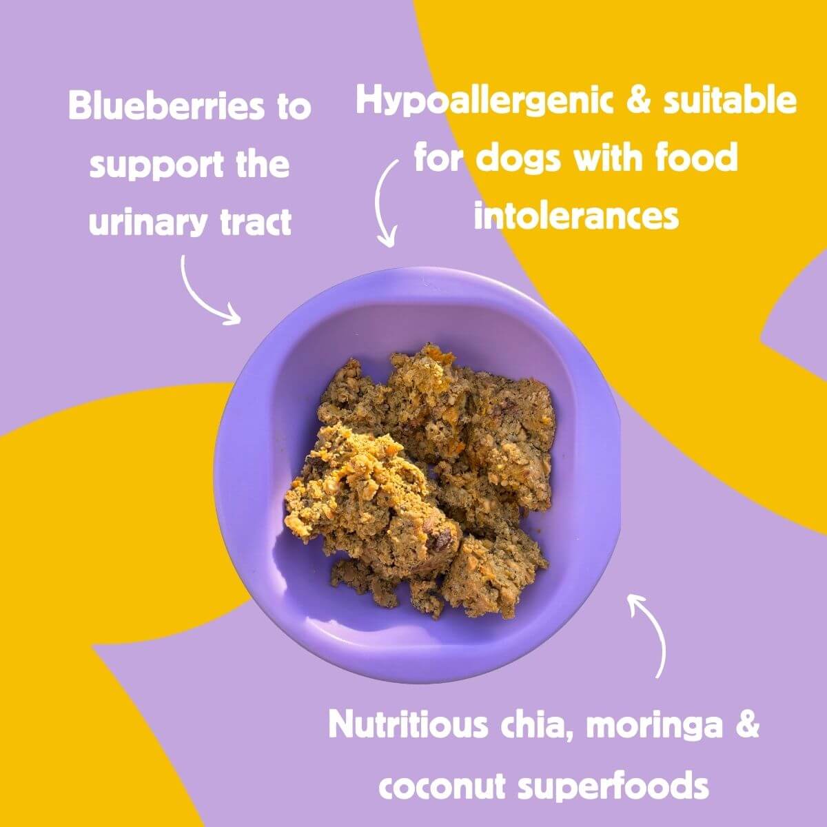 Better food for a better mood, this yummy breakfast recipe allows your dog to safely (and healthily) have alternative protein, with a flexitarian or fully plant-based diet. With vegan D3 as well as antioxidants, pre- and probiotics, our 100% clean-ingredient recipes are perfect for pooches with meat protein allergies, sensitive skin and delicate tummies.