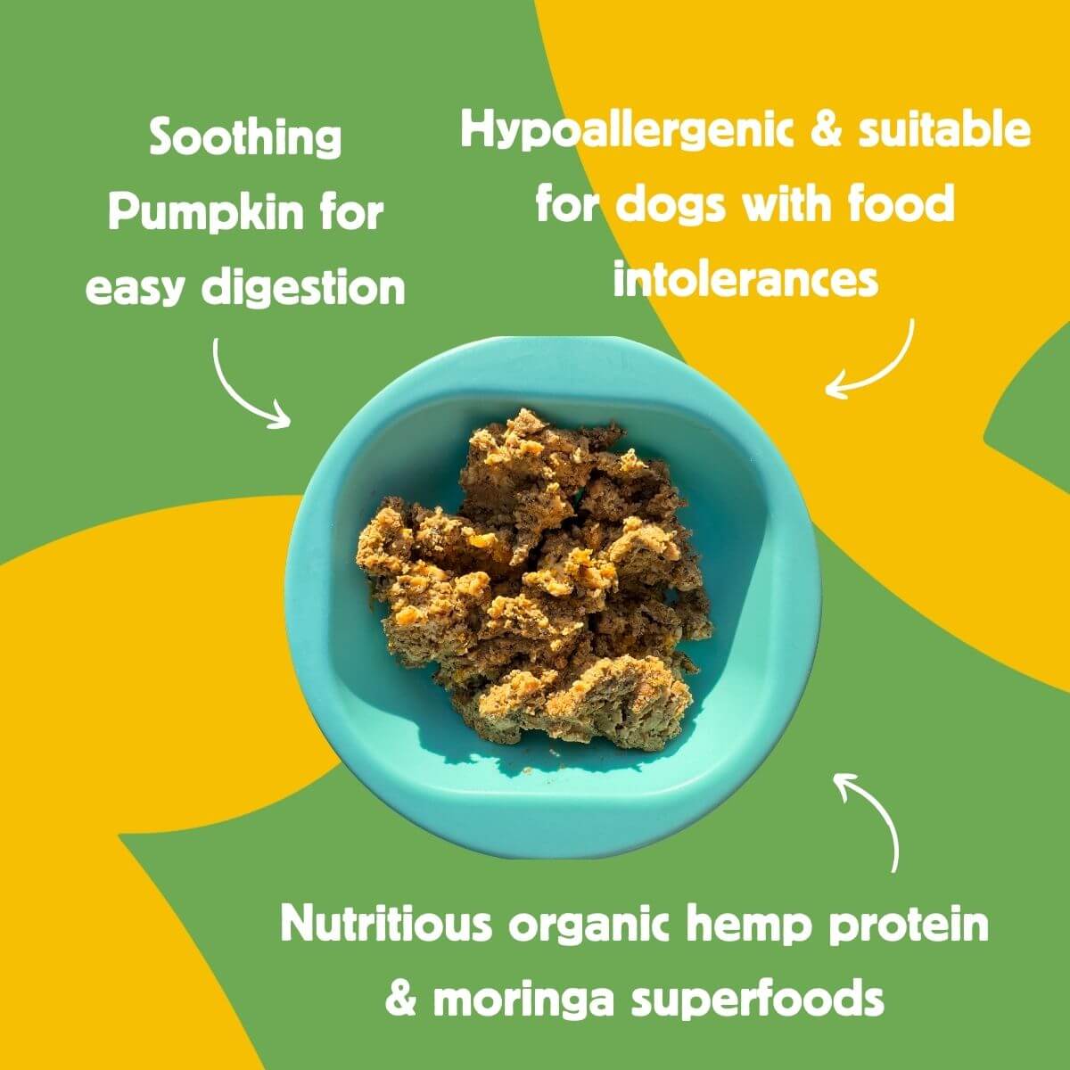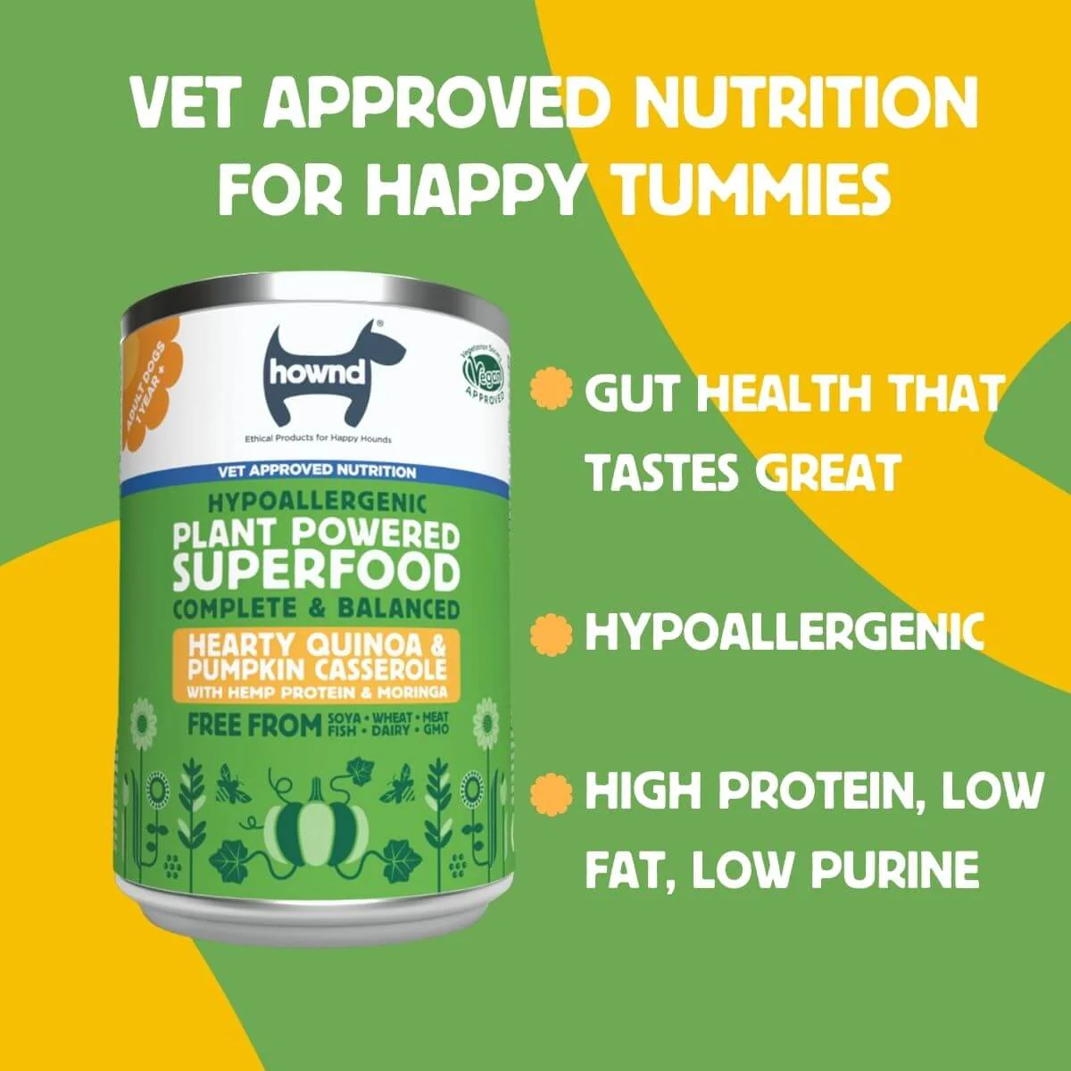 Dogs need specific nutrients to thrive and not specific ingredients. HOWND Hearty Quinoa and Pumpkin Casserole with Organic Hemp Protein and Moringa is a delicious nutritionally complete meat alternative to serve to your four-legged best friend at any mealtime.